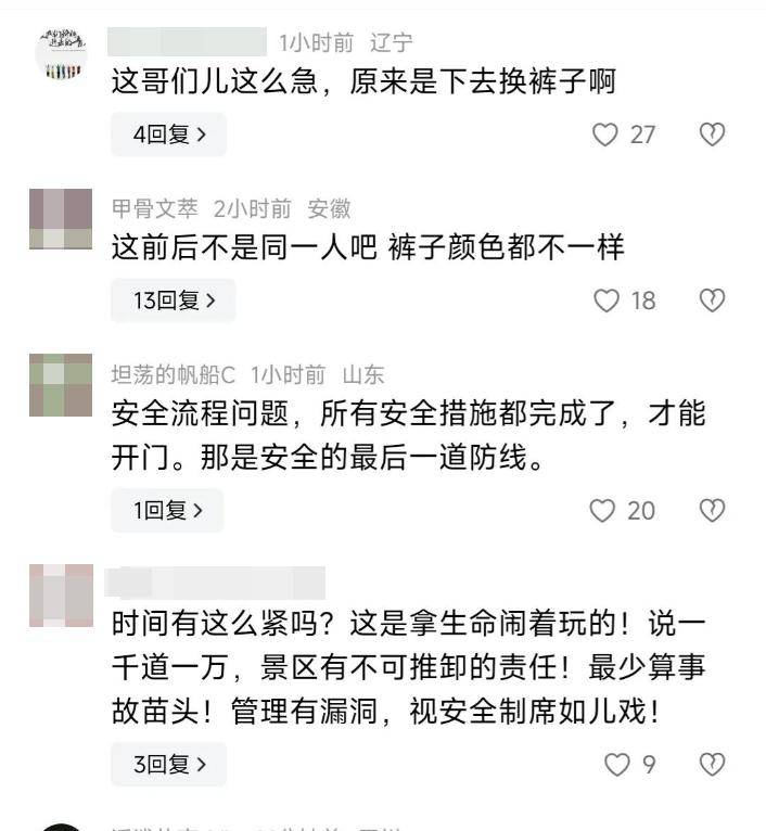 随着讨论逐渐升温,涉事男子也站出来澄清,称自己在蹦极前并没有刻意为之,只是跳得太快导致了工作人员没有反应过来。他希望大家不要过于担忧,自己也没有受伤。虽然他的话暂时平息了部分舆论,但这一事件所引发的安全问题依然值得深思。